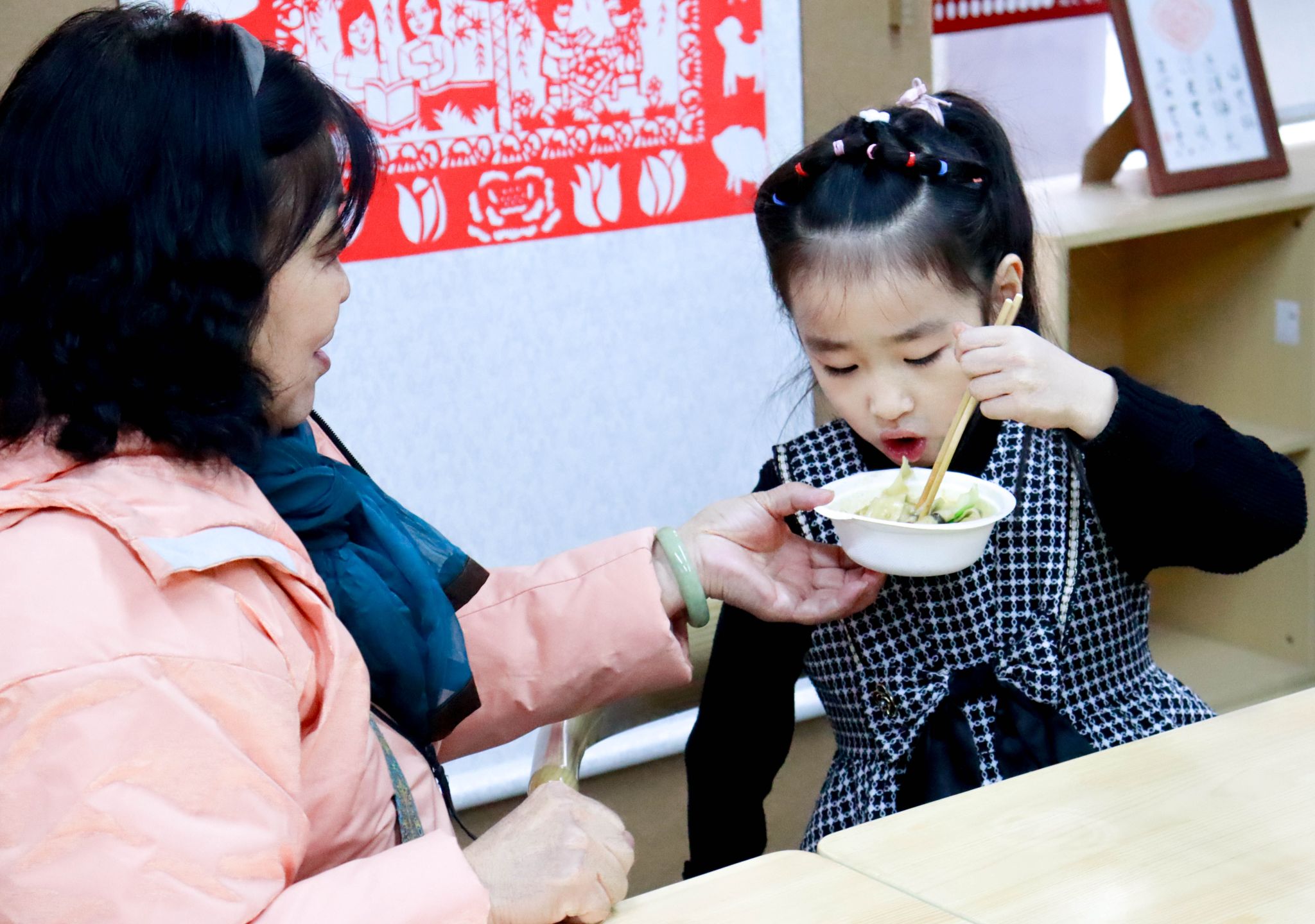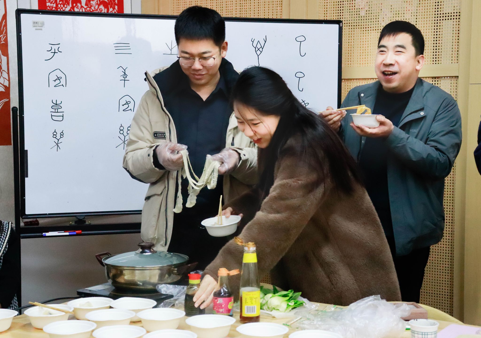移步餐桌,桌上的扯面引起了老师们的注意,黑板上甲骨文的祝福语也充满着神秘。随着黑板上甲骨文的面纱被欢乐的互动揭开,师长们提笔在扯面上写下刚认识不久的甲骨文朋友,传递出浓郁的文化气息。经过同扯面的一番较量,拉拉扯扯,长长久久的“甲骨文长寿面”出锅,更添喜庆,皆承载着诚挚祈愿。