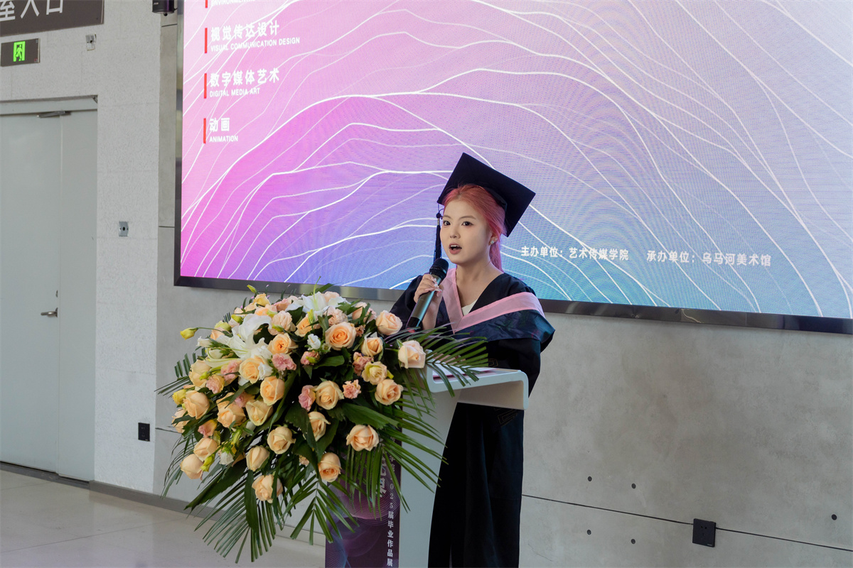 毕业生代表杜佳艺同学分享创作心得时表示:学院倡导“设计思维解构传统、科技手段表达思想”理念,使其在创作中实现了从理论到实践的跨越。教师代表刘晓婷老师以“200 帧手稿打磨 1 秒动画”为例,生动诠释学院对“工匠精神”的培育导向,强调专业教育中精益求精态度的塑造价值。