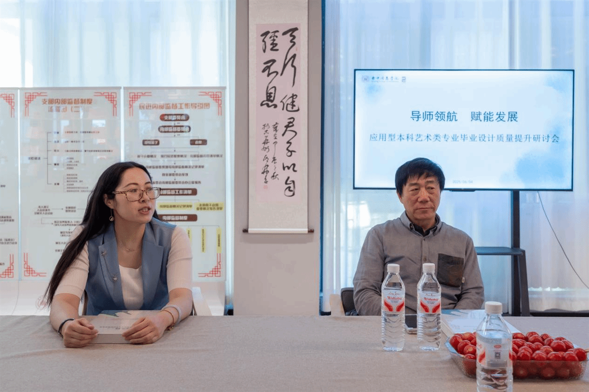 观展后,艺术传媒学院教师与嘉宾,在上河书院召开了“导师领航 赋能发展——应用型本科艺术类专业毕业设计质量提升研讨会”,副院长孙琪主持研讨会。山西大学美术学院武小明教授指出:“推行双导师制,为学生配备专业导师+行业资深设计师双导师,全程指导。打造“实景化”创作场域,鼓励学生深入合作企业、项目现场进行调研与实践,利用工作室、创新工坊模拟真实工作流程与环境,让设计在真实的土壤中生长。”座谈会后,院长盛卓立向与会专家赠送学校《梦想与实践》教育书籍,传递学校“以学生发展为中心” 的育人思想。