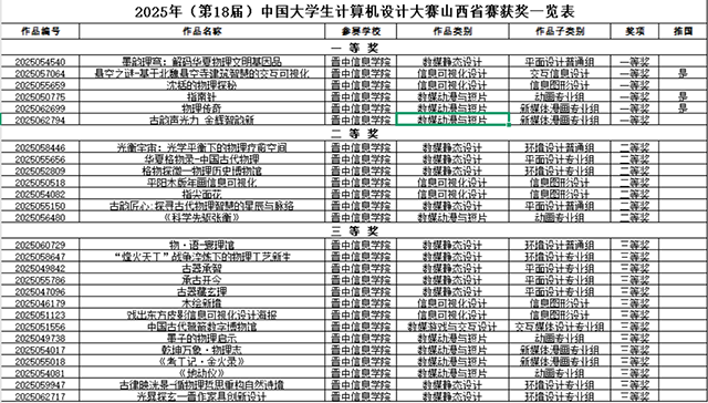 2025年(第18届)中国大学生计算机设计大赛山西省赛和全国总决赛落下帷幕。我校艺术传媒学院参赛师生在本届大赛山西省级赛中荣获6项一等奖、7项二等奖、14项三等奖。经省级评委会推选,有3项一等奖作品推荐参加全国总决赛,分别是信息可视化设计组:交互信息设计作品《悬空之谜-基于北魏悬空寺建筑智慧的交互可视化》和数媒动漫与短片组:动画专业作品《指南针》以及新媒体漫画专业作品《物理传奇》。3项选送作品经国赛现场答辩展示,全部再创佳绩,均荣获国赛三等奖,与同年相比,艺术传媒学院师生在本届大计赛国省赛中斩获荣誉数量有显著提高。