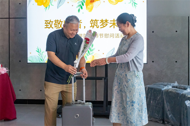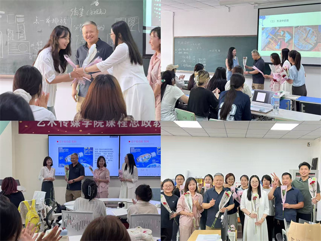 最后,学院院长盛卓立携副院长孙琪、李风娇轻步走进教学长廊,以“推门送福”的温情方式开启特别慰问。三人手持花束,逐间轻叩教室门扉,在师生们惊喜的目光中,为正在授课的一线教师献上节日祝福。师生们自发响起热烈掌声,教室里洋溢着浓浓的节日温情。