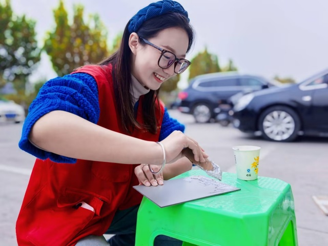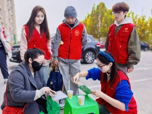一位志愿者蹲在绿色小凳旁,手持宣传资料,耐心地向社区居民讲解城市精细化治理的相关内容,居民专注聆听、认真翻阅资料;旁边几位志愿者或关注讲解过程、或随时准备提供协助。他们以亲切的姿态、专业的讲解,搭建起社区与居民之间的沟通桥梁,将“奉献、友爱、互助、进步” 的志愿精神融入每一次交流,为社区精细化治理注入青春活力,也让自身在实践中深化了对社会责任感的认知。