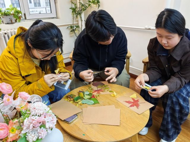 三达书院的意空间是此次活动室内创作的核心区域。创作过程中,鼓励师生在落叶上面画下自己喜欢的一些卡通人物,用卡纸将树叶组成自己喜欢的留作纪念。除了落叶收集,活动现场的“创意手作” 更是人气爆棚。在这里,师生们可以发挥想象,将普通的落叶变成精美的手工艺品。桌上的胶水、剪刀、彩笔、卡纸,同时还提前准备了透明书签、贴画等样品,为大家提供创作灵感。