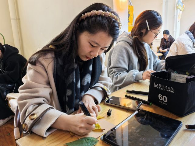 在落叶收集环节结束后,大家纷纷带着自己的“战利品” 前往活动指定的创作区域,开始了紧张而有趣的创意制作。有的同学专注地将落叶整理平整,小心翼翼地夹进透明书签里面弄平整;有的同学则发挥自己的绘画天赋,在落叶上勾勒出可爱的卡通形象、优美的风景图案;还有的同学用落叶编织出落叶魔法帽、手链等手工艺品。整个创作区域充满了创意的火花,每个人都在用心打造属于自己的秋日作品。