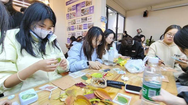当秋风拂过校园的树梢,金黄的银杏、火红的枫叶、橙黄的梧桐叶纷纷飘落,为教学楼前的小径铺上了一层厚厚的“彩色绒毯”。 2025年11月5日下午 16:00—17:30艺术传媒学院“落叶叙情,倾尽相思-让每片落叶都有故事”在三达意空间进行,在此举办了一场的手工制作活动,邀艺术传媒学院学生以叶为媒,同学们化身 “自然收藏家”,用双手拾起秋日馈赠,用创意赋予落叶新生,让这个秋天的校园充满了温暖与惊喜。