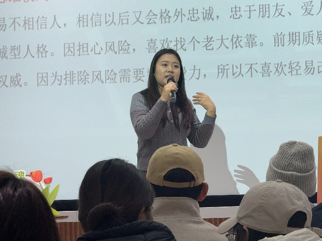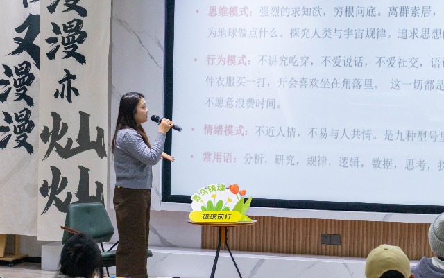冯老师一开场便抛出引人深思的观点:“我们大多数人其实都处在一种‘性格自动驾驶’状态,横冲直撞,直到撞得伤痕累累。”她巧妙地将完满人格理论比作一本我们一直缺失的《人类意识使用说明书》,而学习它的目的,正是让我们从被动承受性格本能,转变为主动驾驭人生的“魔法师”。冯老师以“苹果砸头”为例,描绘了不同人格的生动反应:1号完美型会立刻追问是谁种的树不合规范;5号思考型则会像牛顿般陷入“苹果为何不往上飞”的沉思;而7号活跃型可能兴奋地摇树,期待下一个苹果落下……这些鲜活例子让同学们在笑声中迅速领悟人格差异的奥妙,现场氛围轻松而热烈。