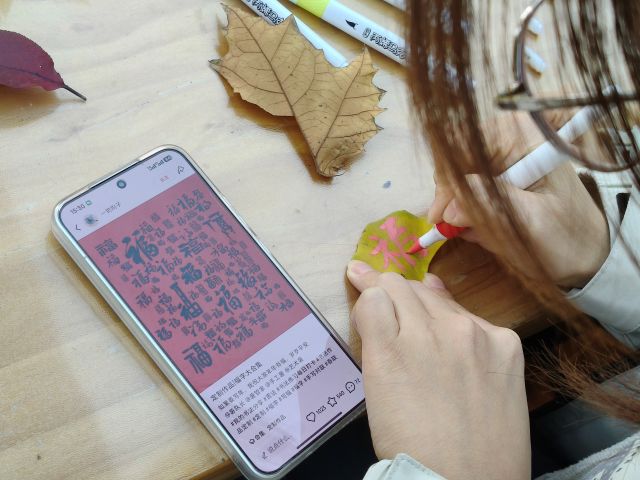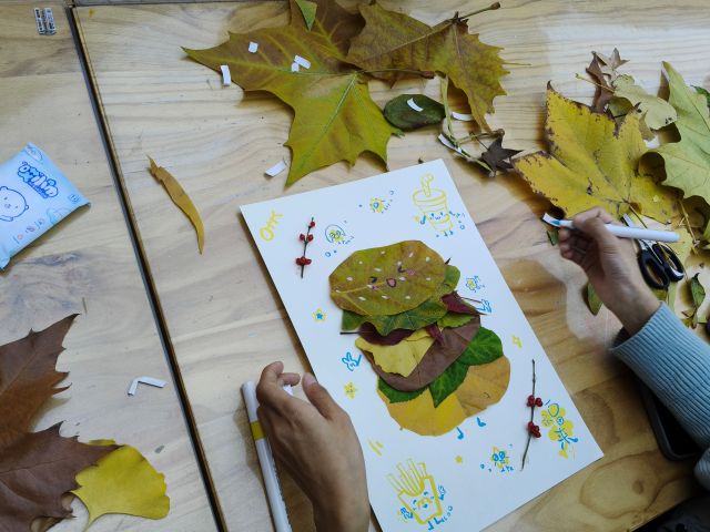 活动以“自然收获”开始进行,用干树叶拼贴秋日场景,搭配文字记录“我眼中的秋天”。组织者提前收集了梧桐叶、银杏叶、枫叶等十余种形态各异的干树叶,还准备了卡纸、固体胶、彩笔等材料,整齐摆放在创作桌上,供学生们自由挑选。同学们可以按照自己眼中的秋天自己选择材料来完成作品。