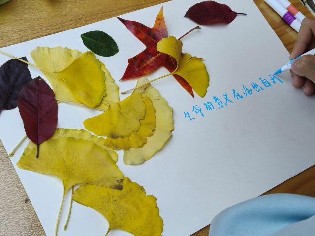 在体验秋天自然丰收的同时,同学们也可以在团队合作、团队分享中获得独属于自己的“成长收获”,同学们可以在自己制作的秋日落叶作品中写下近期学习、生活中的小进步,亦或者一些自我感悟,让“收获”从抽象感受变为可感知的具体价值。