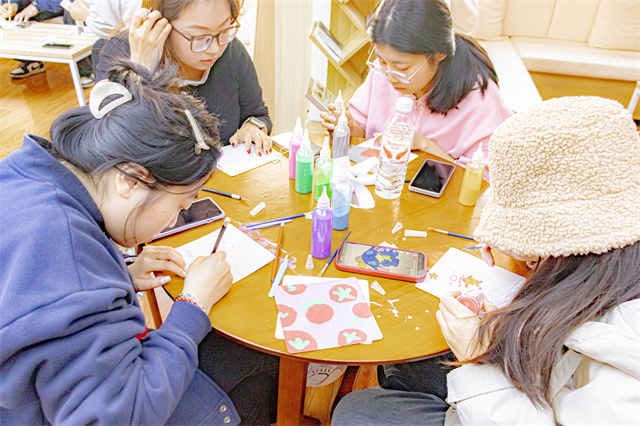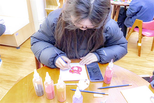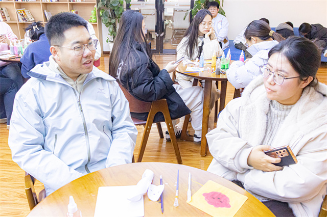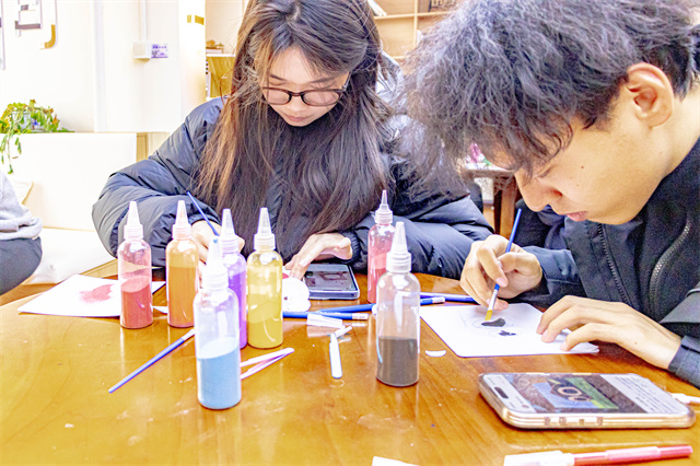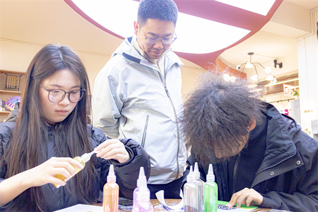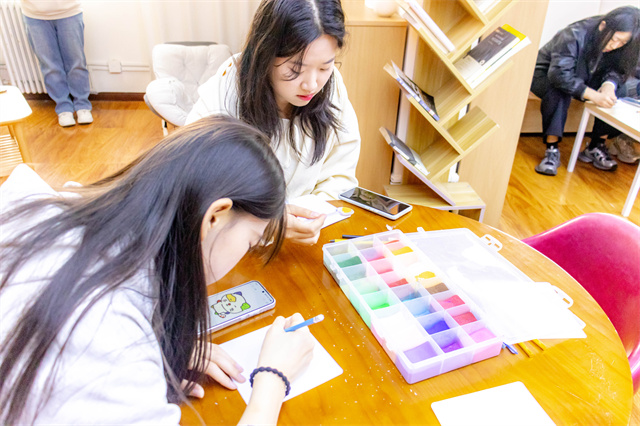 创作时,学生们低头专注于眼前的卡纸,时而微调沙粒的分布,时而拿起手机比对自然图片的细节。刘晓雄老师走到学生身边,拿起一张半成品说:“把你看到的自然,用沙粒讲出来就好。” “艺术不是‘复制’自然,而是用沙粒的质感‘翻译’自然的心跳。”围坐的学生们时而低头专注“播种”沙粒,时而举着作品与同伴碰出灵感,桌上的画笔、沙瓶与半成品卡纸,成了一间流动的“自然画室”。