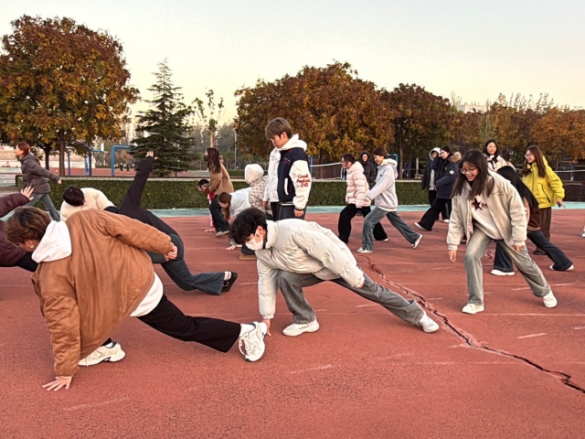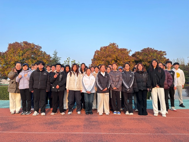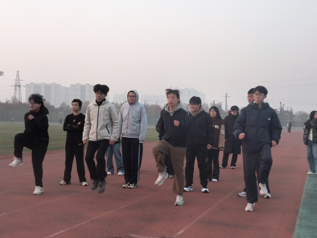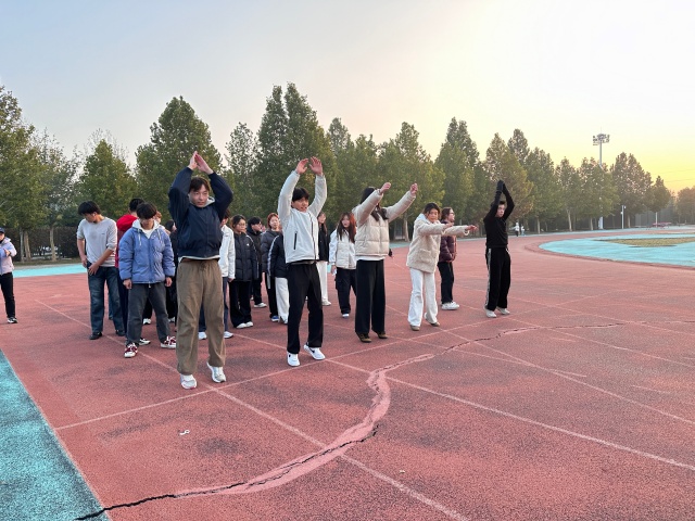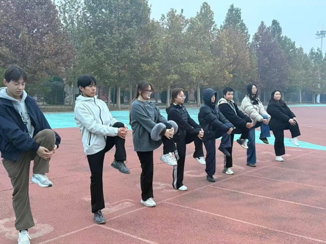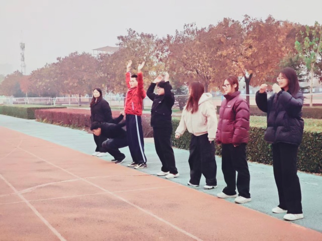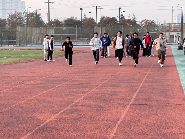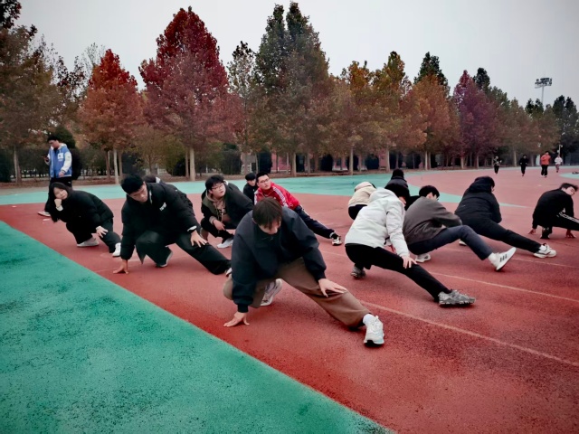 慢跑设定为5 圈约 2 公里,距离适中——既不短到达不到热身效果,也不长到让体能较弱的同学却步,恰是与身体的温柔对话。哨声响起,同学们陆续迈步,起初队伍节奏参差:体能好的步伐轻快、呼吸平稳,运动少的则略显局促、步频稍缓。随着集体前行节奏渐趋统一,耳边的脚步声从杂乱变得整齐,宛如一首合拍的晨曲。