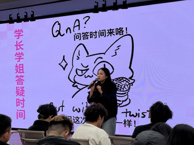 在学姐分享结束后,展开了现场的问答环节。在此期间,同学们都很积极的提出问题,学姐们都真认真的给予回答。从日常的学习问题到部门以及完满活动问题的解答再到各种证书的考核问题,现场氛围活跃。