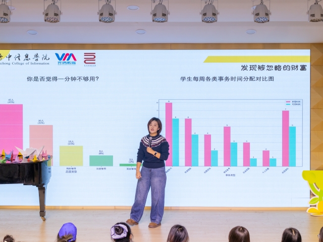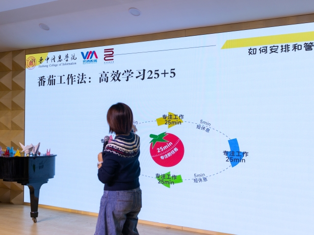 方法论的价值,在于为迷惘的灵魂照亮前路。针对大三学生的核心需求,高老师分享了番茄工作法、碎片化时间整合、目标拆解等实操技巧,她赋予同学们的不仅是管理时间的工具,更是直面未来的底气与勇气。光影交错的现场,一片星光从场地后方亮起,蔓延成璀璨星河。伴随着《时间都去哪儿了》的旋律,同学们在光影中共鸣:“少壮不努力,老大徒伤悲”,珍惜每一分钟,便是对青春最好的回应,对未来最坚实的铺垫。