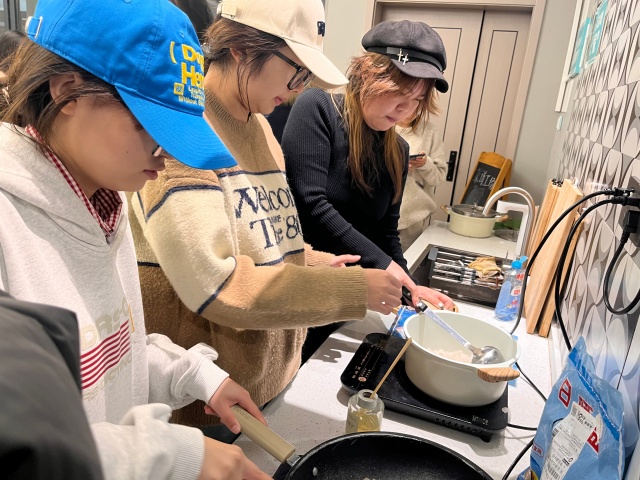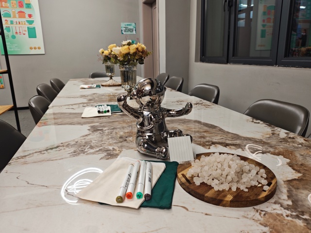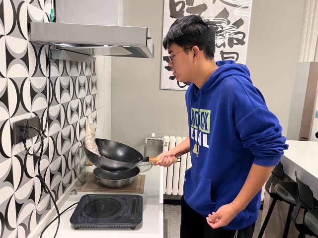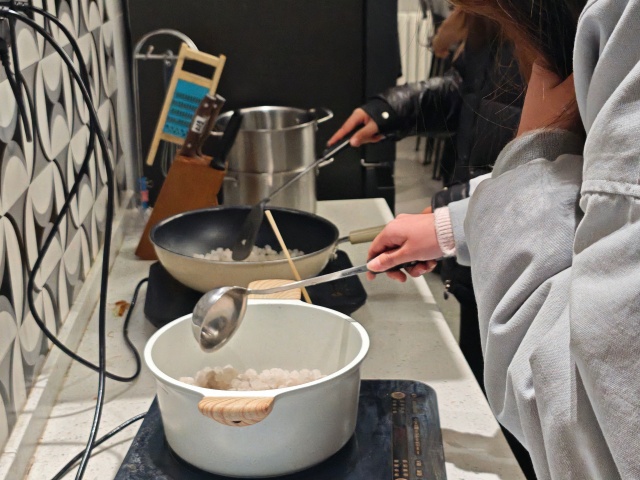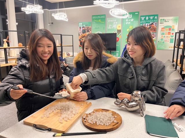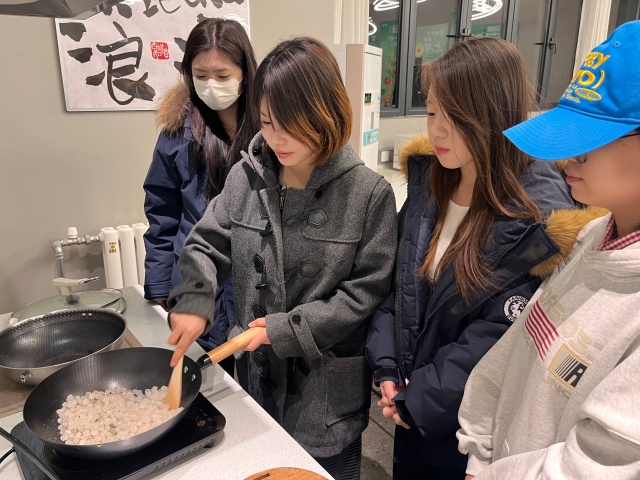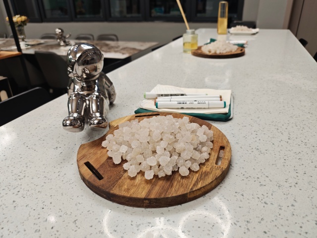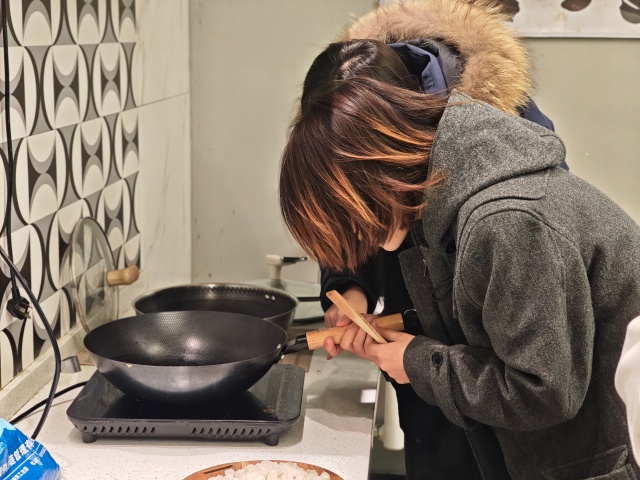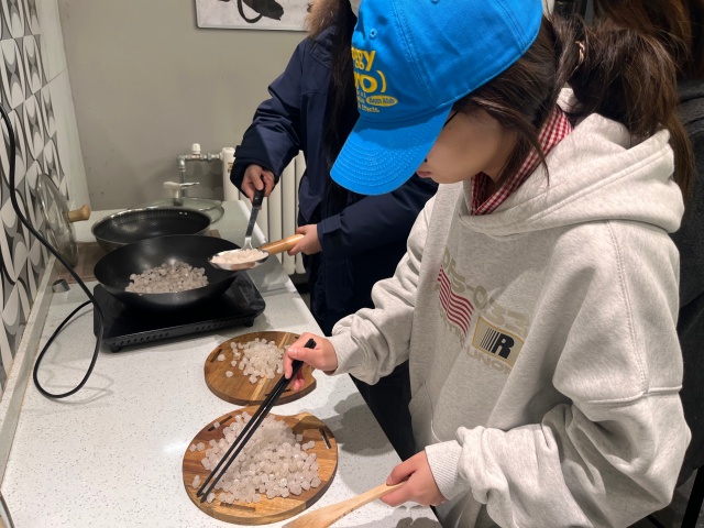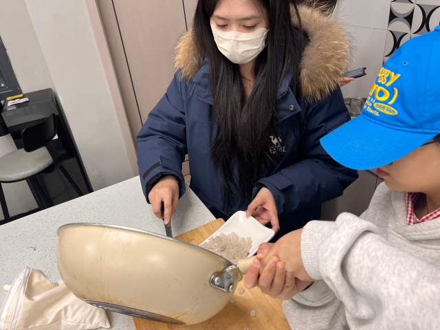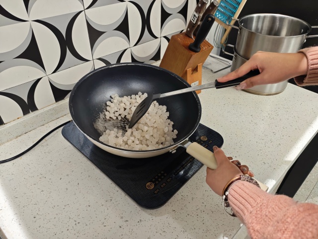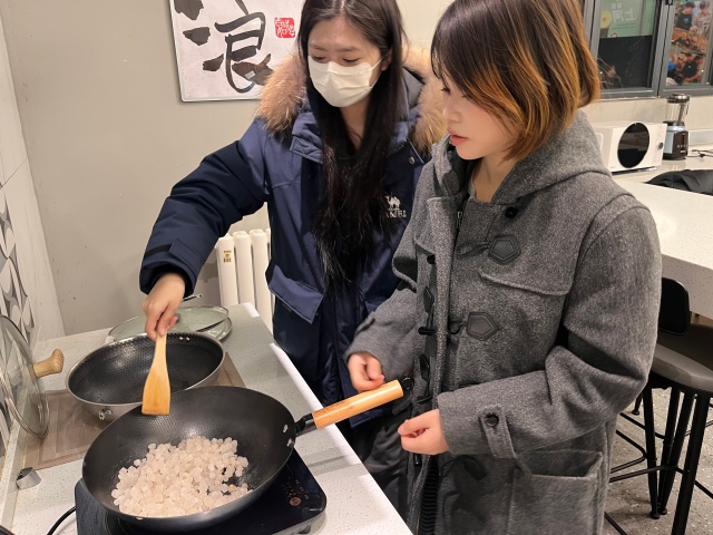 “炒粗盐可是个技术活,中小火慢炒才不会焦,炒到盐粒发烫但不冒烟就刚好!”活动刚开场,来自生活委员郭昱焜的经验分享就吸引了大家的目光。右岸厨房的操作台前很快分成了“热力炒制组”和“创意装饰组”,各司其职又默契配合。