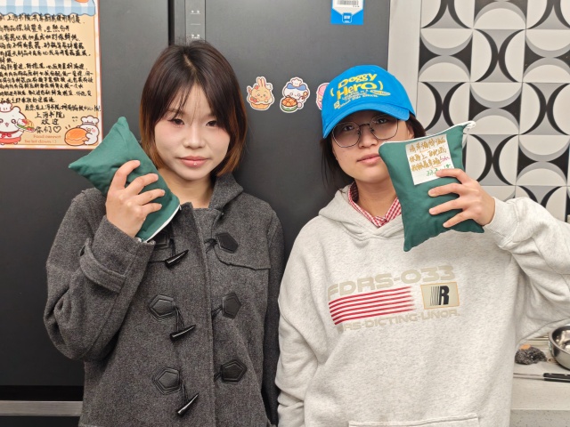 热力炒制组的同学们围在电磁炉旁,一手扶着锅沿,一手握着木铲匀速翻动,洁白的粗盐在锅中慢慢升温,原本松散的颗粒渐渐变得温热紧实,淡淡的咸香混着锅具的温度,在空气中晕开温暖的气息。创意装饰组的同学们充分发挥专业优势,用马克笔在布袋上翻飞,有的画出戴着围裙的卡通宿管阿姨形象,有的用艺术字体写下“暖心守护”、“您辛苦啦”等祝福语,还有人贴上自己设计的小贴纸,让每个布袋都成了承载心意的“专属定制款”。