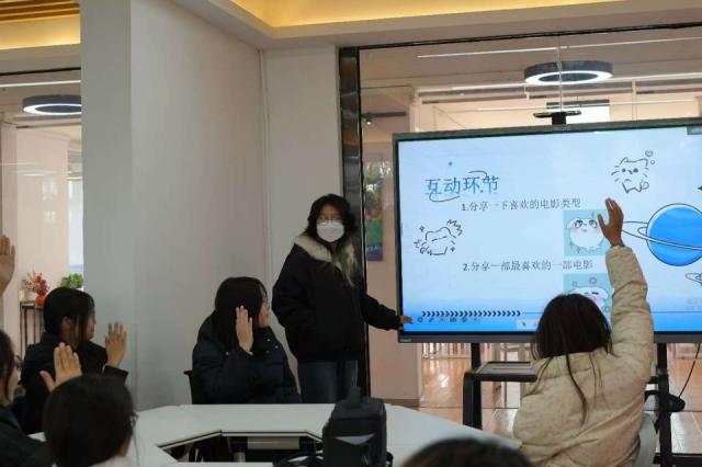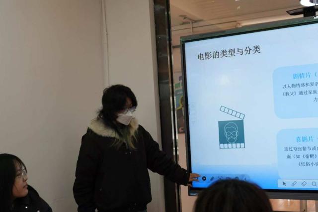 翻开PPT首页,赛博感十足的星球背景配上“电影基础知识”“艺术分析”等模块,活像一本“电影宇宙生存手册”。在“类型分类”页,喜剧片被标注为“笑点爆梗制造机”,科幻片成了“未来脑洞试验场”,连纪录片都有了“真实事件摄影机”的可爱注解——“本来觉得电影分类是‘白开水知识点’,现在像在拆影视版盲盒。”现场同学笑称。