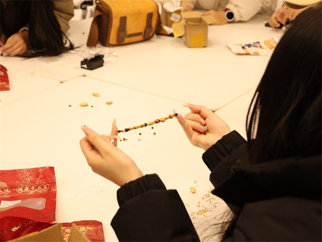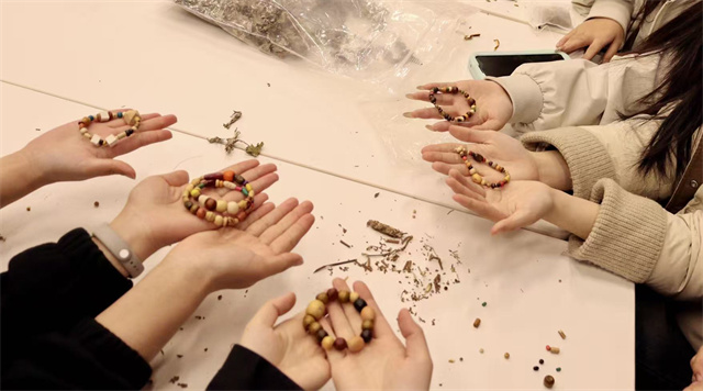 手作台一角,叠放着印着娟秀字迹的“药材笺”,浅米色的纸上,用墨笔写着每味药材的性味与功效,寥寥数语,尽藏古方智慧。工作人员将“药材笺”随针线递至学生指尖,轻声讲解:“这茉莉不仅香雅,还能舒解郁结之气,做进香囊里,随身带着很合适”“陈皮陈放越久越醇,理气健脾,串在手环上,既有韵味又有裨益”。