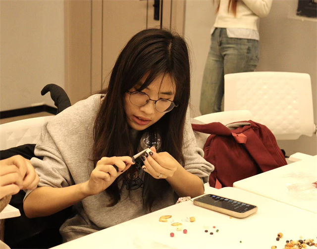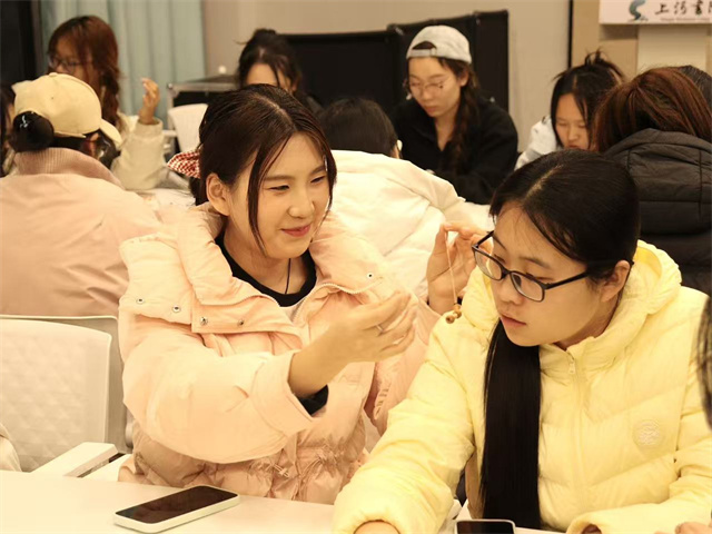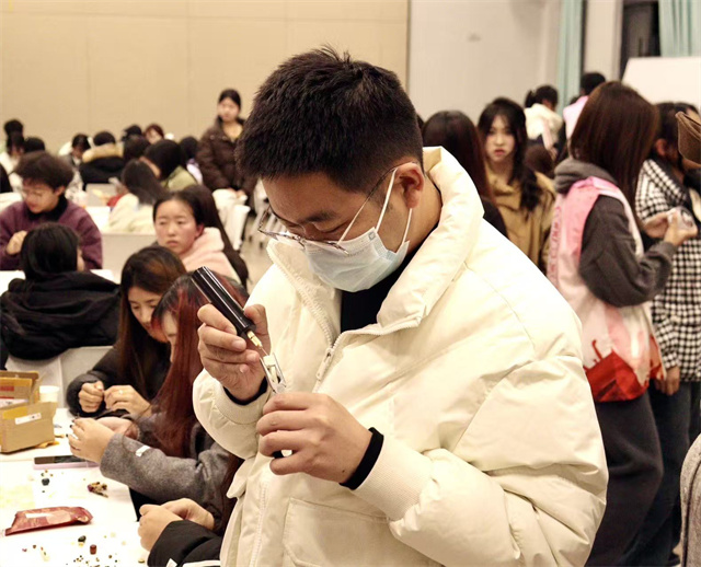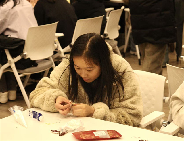 上河书院赋能空间里的灯光格外柔软,透过纱帘洒在铺着素色绒布的手作台上,晕开一层暖融融的光晕。桂花的甜润、艾草的醇厚、茉莉的清芬交织,学生们围坐台前,指尖捻起干燥的桂花,细细缀在银质耳饰底座上,织在一起,与银饰的冷冽光泽撞出奇妙的韵律——“本草寻韵,雅饰生香”中医药手作活动,正于此间悄然启幕。