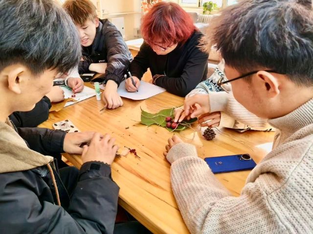 长桌被各色自然材料铺满:金黄的银杏叶、深红的枫叶、形态各异的枯枝与饱满的松果错落摆放,搭配彩笔、胶水、麻绳等工具,构成了创意十足的“创作基地”。参加者们围坐其间,或俯身挑选素材,或低头专注拼接,将自然肌理与宿舍标识巧妙融合——有的用枯枝搭建出门牌框架,嵌入彩漆勾勒的宿舍号,简约中透着质朴;有的以完整的落叶为底,叠加干花、野果点缀,层层叠叠间尽显森系浪漫;还有的将枝条修剪成特殊造型,与数字组合成兼具个性与辨识度的设计,每一件作品都承载着专属的创意巧思,原本普通的枯枝落叶,在巧手下变成了带着“秋末温度”的门牌作品。