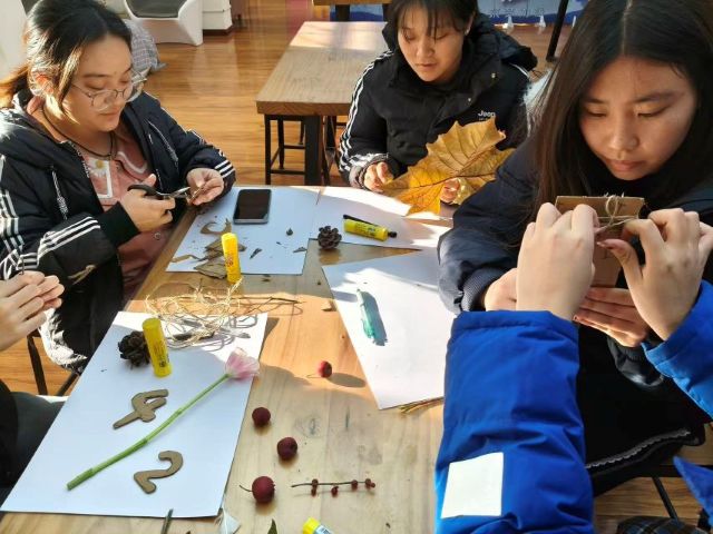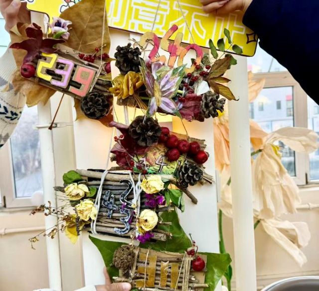 在“树枝门牌”制作中,热闹非凡。同学们以枯枝、落叶、松果为材,亲手打造专属宿舍门牌,让秋冬的自然元素成为校园生活的“温暖装饰”。以宿舍为单位分工协作,将干枯的枝干修剪成合适形状,搭配色彩斑斓的落叶与小巧的花朵,再用绳子缠绕固定,一个个充满个性的门牌不仅承载着深厚的宿舍情谊,更成为装点校园生活的独特风景。