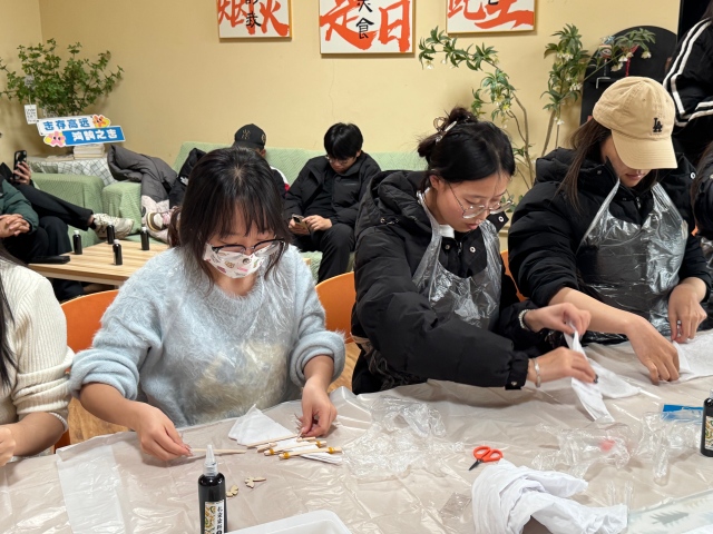 活动前期,班委团队精心统筹,各小组分工协作:物料组提前采购白色纯棉方巾、T 恤、扎染专用染料、橡皮筋等物资并细致分装;后勤组完成场地布置,铺好防滑报纸、整齐摆放桌椅;技术组邀请专业指导嘉宾,提前学习扎染核心技艺,为活动顺利开展筑牢基础。同学们通过 “指尖派” 线上报名通道踊跃参与,满怀期待迎接这场非遗文化盛宴。