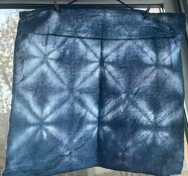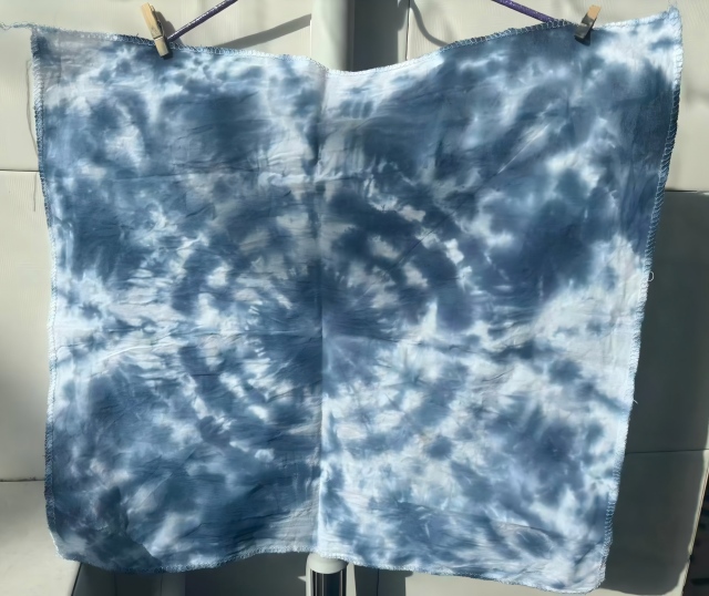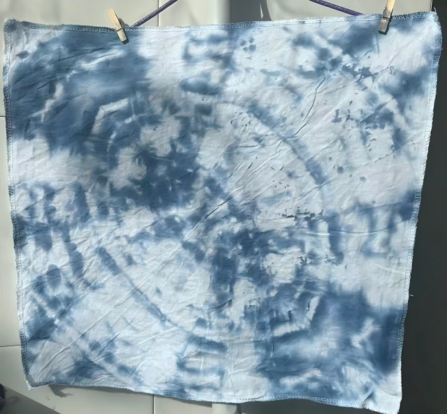 动手创作环节成为活动的核心亮点。同学们分成6-8 人小组,领取物料后迅速投入创作。大家围绕图案构思展开热烈讨论,互相帮忙扎结布料,巧妙运用橡皮筋固定创意造型;在染色环节,大家戴上一次性手套,小心翼翼地调配染料、浸泡布料,蓝色与布料交融碰撞,演绎出独一无二的色彩故事。总负责人在现场巡回指导,及时提醒大家避免染料溅出与污染,确保创作过程安全有序。经过扎结、染色、静置、冲洗、晾干等一系列步骤,原本洁白的布料逐渐绽放出绚丽的花纹,每一件作品都凝聚着同学们的创意与巧思。