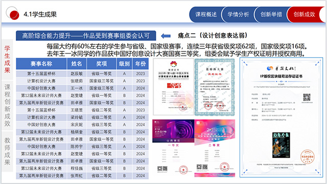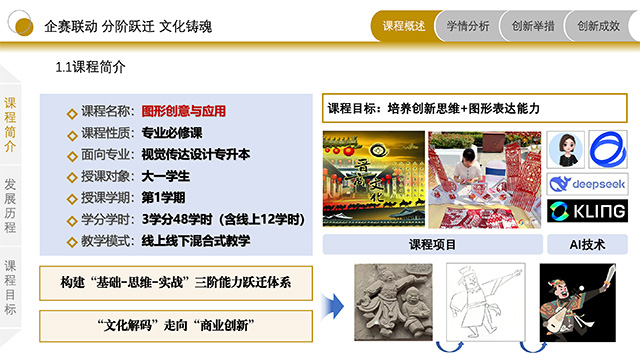 孔霞老师所选取的《图形创意与应用》课程,是视觉传达设计专业的专业必修课,致力于培养具有跨媒介信息化高素质应用型设计人才。“教学创新的终极目标,是让每名学生成为兼具文化自信与技术能力的时代设计者。”孔霞老师强调。在教学过程中,孔霞老师坚持以“企赛联动、分阶跃迁、文化铸魂” 为主线,创新构建“双驱·三阶·五维”的进阶式创新理念,为学生打造了一条从理论知识到实际应用的清晰成长路径,实现从传统文化解码到商业创新实践的无缝衔接,其“以学生为中心、以产出为导向”的教学范式获得评审专家组高度认可。