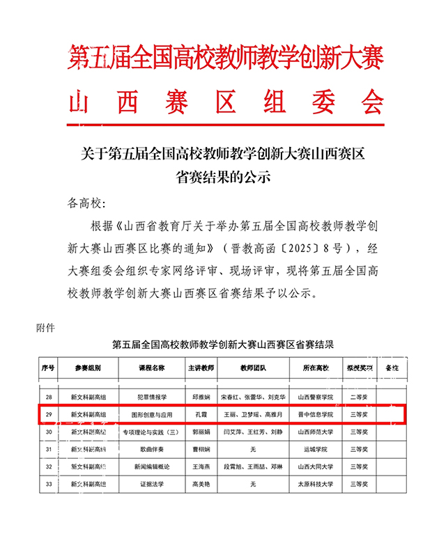 近期,第五届全国高校教师教学创新大赛决赛在山西财经大学举行,比赛汇聚全省众多高校的优秀教师代表,竞争异常激烈。艺术传媒学院视觉传达设计教研室主任孔霞老师凭借《图形创意与应用》课程,以独具创新的教学模式和卓越的教学成果脱颖而出,获得省级三等奖,为学院在国家级教学竞赛中再添标志性成果。