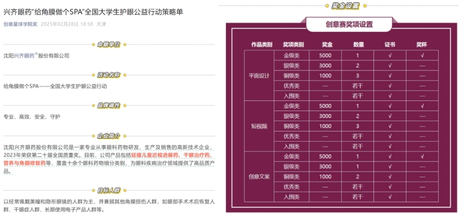 此次获奖作品源自《图形创意与应用》课程的实践教学环节。课程中,教师以学院奖兴齐眼药策略单为实战课题,引导学生深入解读品牌核心价值。自2024年起,兴齐眼药连续2年携手创意星球学院奖发起“给角膜做个SPA——全国大学生护眼公益行动”,让年轻人在创作过程中传递保护角膜就是保护眼睛的相关知识,降低专业壁垒,树立品牌心智。兴齐眼药作为专注于眼科药物研发与生产的知名企业,其“保护角膜=保护眼睛”的品牌理念为创作提供了丰富灵感。教师团队通过专题讲座、案例分析、一对一指导等方式,帮助学生将专业理论转化为创作动能,从图形符号提炼、色彩情感表达、视觉叙事逻辑等维度展开深度创作。