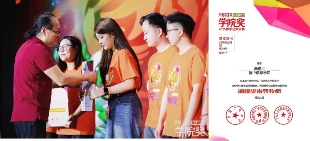在颁奖现场,广告人文化集团董事长李文龙先生亲自为高雅月老师颁发优秀指导教师奖。这一奖项不仅是对高雅月老师个人教学成果的高度认可,也是对晋中信息学院视觉传达设计专业教学水平的充分肯定。高老师表示,此次获奖是课程教学改革的重要成果,未来将继续推动“以赛促学、以赛育人”模式,让更多学生在实战中成长。