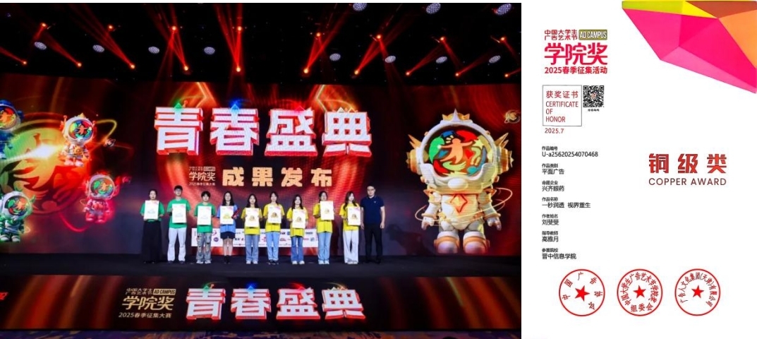 7月31日,备受业界关注的中国大学生广告艺术节学院奖颁奖盛典在北京广播电视台隆重举行。我院视觉传达设计专业教师高雅月带领学生刘斐斐同学凭借为兴齐眼药创作的平面设计作品,从全国数千份参赛作品中脱颖而出,斩获学院奖全国铜奖,成为本次赛事中备受瞩目的新锐力量。
