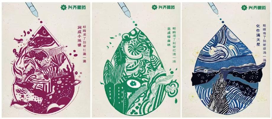 参赛学生历经两个月的打磨,先后完成三版方案迭代。作品围绕眼药使用展开,以“眼睛渴了别硬扛,滴一滴”为宣传点,将眼药滴入眼睛后的效果进行诗意化呈现。把眼药滴入后,眼睛所及之处化作小池塘,画面中水滴内部有鱼、水草等池塘元素,色彩以红紫色为主,营造出灵动的水中世界氛围;眼药滴入后,眼睛看到的是绿森林,水滴内是茂密的树木、可爱的动物等森林元素,绿色为主色调,传递出清新自然之感;眼药滴入后,眼睛仿佛看到满天星,水滴内是星空、山峦等元素,蓝白色调为主,营造出梦幻、静谧的氛围。该作品在初评、复评环节连续获得评委肯定,最终跻身全国铜奖行列。