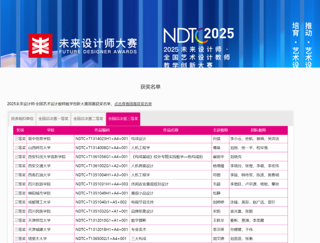 本届未来设计师·全国艺术设计教师教学创新大赛(NDTC)是入选中国高等教育学会《全国普通高校教师教学竞赛榜单》的重要赛事,在全国高校教学中具有广泛影响力。作为国内首个专注于艺术设计学科教学创新的全国性竞赛,该大赛旨在推动艺术设计教学体系改革,促进教学理念与方法创新。本届比赛竞争异常激烈,吸引了来自全国416所高校的1066支参赛队伍,参赛教师达5186名。晋中信息学院教师能在如此高水平的比赛中脱颖而出,体现了学校在教学创新方面的实力。