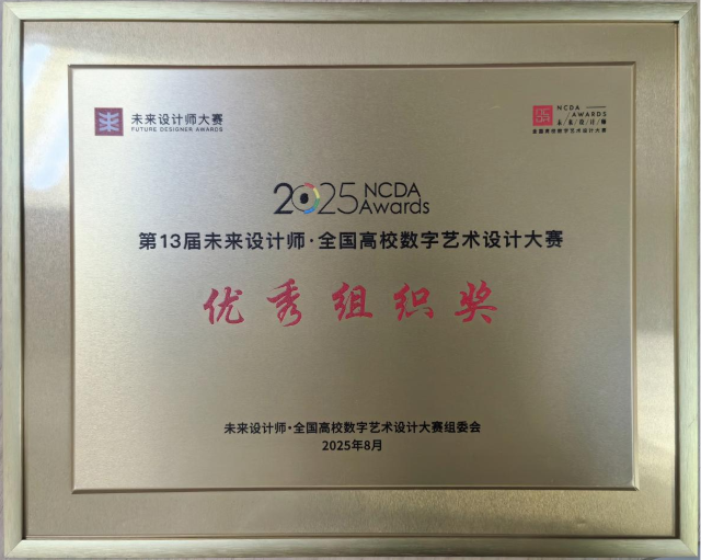 近日,第13届未来设计教育论坛暨2025未来设计师·全国高校数字艺术设计大赛(NCDA)及未来设计师·全国艺术设计教师教学创新大赛(NDTC)颁奖典礼在成都隆重举行。晋中信息学院艺术传媒学院凭借出色的组织工作和优异的比赛成绩,荣获“优秀组织奖”。