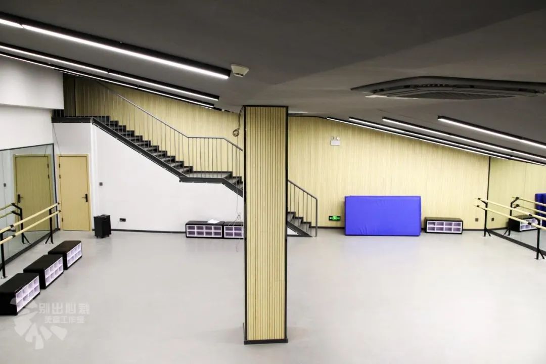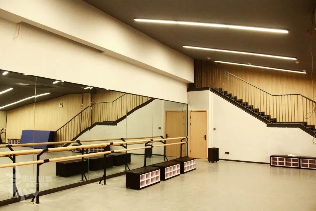 多功能排练厅2采用专业地胶、壁镜和可依据学生身高调整高度的把杆。配有多媒体设备、音响及钢琴等,为学生提供教学、形体训练、舞蹈编排的训练场地,同时进行教学和训练,可展开集体教学、分组教学、一对一教学。